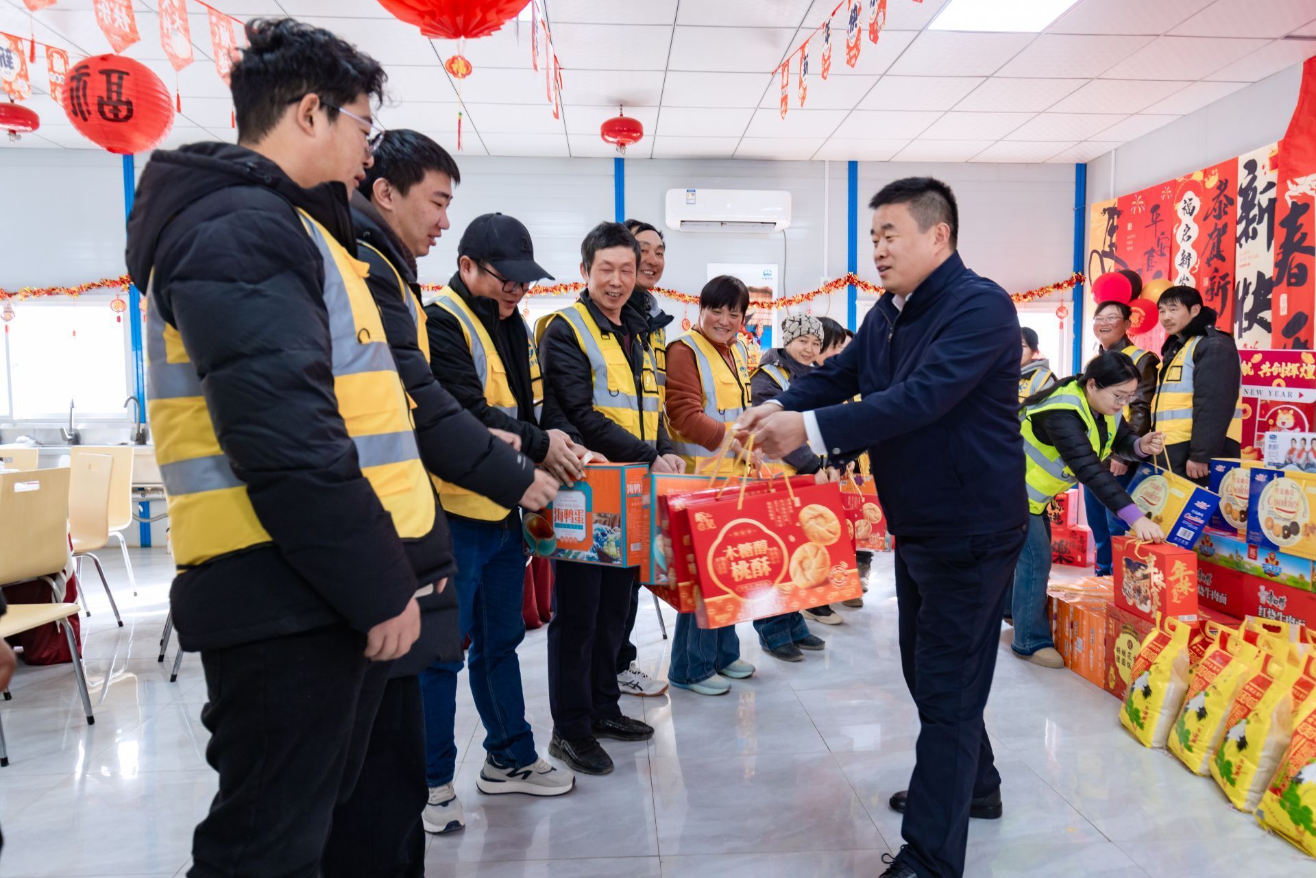 “今天我們一起舉杯,祝大家闔家幸福、新年快樂!”中鐵建工集團第二建設有限公司黨委書記、董事馮明耀,下沉一線與工友們一起過節,現場寫福字,發放慰問品,對項目建設者的付出表示感謝,要求項目部在春節期間要堅守安全生產底線,既要穩妥推進工程進度,又要保證工友們過個祥和歡樂的春節。